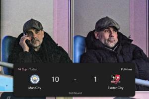 體育資訊01月11日訊 足總杯第3輪,曼城10-1狂屠英甲球隊??巳爻?。本場比賽,瓜迪奧拉因為累計三黃停賽而作壁上觀。