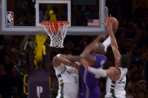 比賽最后時刻30秒,詹姆斯在一次突破中被字母哥蓋帽,在最后一次進攻中又被字母哥搶斷。