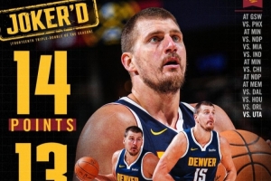 賽季至今,約基奇出場28次,拿到了14次三雙。