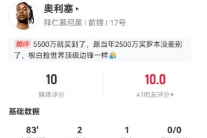 體育資訊1月12日訊 拜仁在本輪德甲7-1領(lǐng)先狼堡,奧利塞本場(chǎng)數(shù)據(jù)如下: