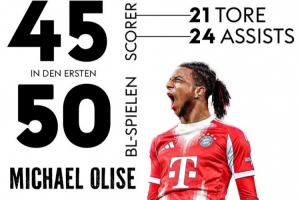 數(shù)據(jù)統(tǒng)計顯示,奧利塞德甲生涯前50場直接參與45球(21球24助攻)。