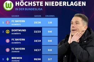 體育資訊1月12日訊 本輪德甲焦點戰(zhàn),狼堡在客場1-8慘敗拜仁,也創(chuàng)下了他們隊史最大比分輸球紀(jì)錄。