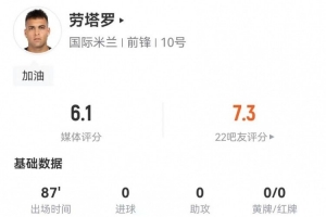 體育資訊1月12日訊 國(guó)米在本輪意甲對(duì)陣那不勒斯,勞塔羅本場(chǎng)數(shù)據(jù)如下: