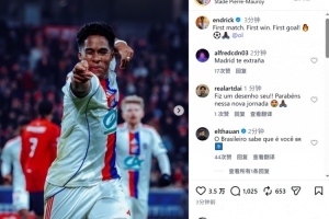 恩德里克冬窗被皇馬外租至里昂,他首次為里昂出場就斬獲進球,賽后恩德里克社媒曬出慶祝進球的照片,配文:“首秀、首勝、首球!”