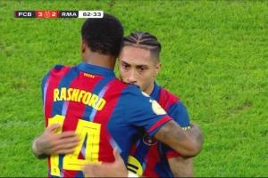 西班牙超級杯決賽,巴薩3-2擊敗皇馬奪冠。拉什福德第83分鐘換下拉菲尼亞,第95分鐘時巴薩3-2領(lǐng)先皇馬,拉什福德跑出半場大單刀,慢悠悠錯失良機。轉(zhuǎn)過頭來皇馬進攻,姆巴佩直塞禁區(qū),居萊爾下底倒三角,卡雷拉斯點球點附近直面球門的推射被霍安沒收,巴薩險些被絕平,拉什福德幾乎全程眼神防守。