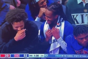 體育資訊1月12日訊 昨日活塞主場92-98不敵快船,比賽中出現(xiàn)有趣一幕。