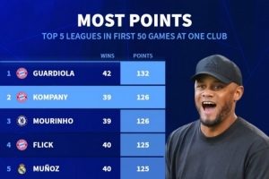 體育資訊1月12日訊 德國轉(zhuǎn)會市場統(tǒng)計了五大聯(lián)賽單一俱樂部主帥前50場聯(lián)賽的積分,并列出前50場聯(lián)賽拿分最多榜單,孔帕尼執(zhí)教拜仁前50場聯(lián)賽拿到126分,僅少于瓜迪奧拉。