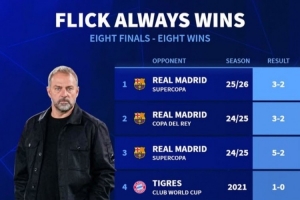 體育資訊1月12日訊 巴薩在本輪西超杯3-2力克皇馬,弗里克延續(xù)了自己執(zhí)教決賽必勝的完美戰(zhàn)績(jī)?!掇D(zhuǎn)會(huì)市場(chǎng)》也回顧了這8場(chǎng)比賽的比分。