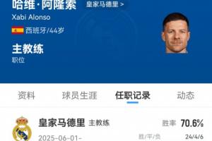 體育資訊01月13日訊 皇馬官宣主帥阿隆索下課,自從夏窗加盟后,阿隆索帶隊(duì)出戰(zhàn)34場(chǎng)比賽,取得24勝4平6負(fù),勝率為70.6%。