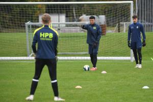 10月22日,在奧地利薩爾茨堡守門員學(xué)院訓(xùn)練場(chǎng),李實(shí)(中)在指導(dǎo)學(xué)員訓(xùn)練。新華社記者 賀燦鈴 攝