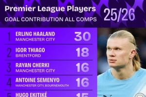 體育資訊1月14日訊 Squawka統(tǒng)計了本賽季英超球員各賽事的參與進球數(shù)量,并列出榜單,哈蘭德參與30球斷層居首。