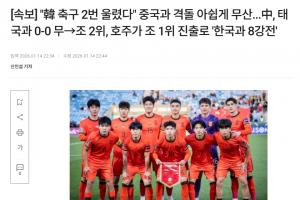 韓媒標(biāo)題為:韓國足球兩度飲恨,與中國對決遺憾落空(中國0-0戰(zhàn)平泰國獲小組第二,澳大利亞頭名晉級將與韓國會師)