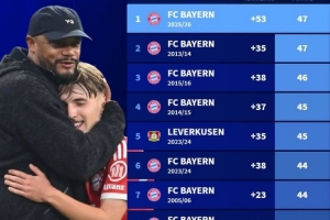 1、拜仁(25-26賽季),凈勝球+53,積分47