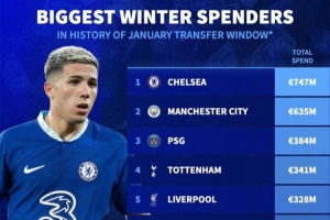 體育資訊1月15日訊 《轉(zhuǎn)會(huì)市場(chǎng)》統(tǒng)計(jì)了截止今年1月15日以來(lái)的冬窗歷史轉(zhuǎn)會(huì)總支出情況,切爾西力壓曼城居首,前十英超占據(jù)8席。
