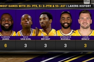 湖人隊史單場至少25分10助&命中3記三分場次:詹姆斯6次最高;東契奇,拉塞爾,科比,范埃克塞爾皆3次