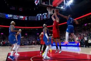 106-107的開拓者落后1分,籃下克林根接球有絕殺機(jī)會(huì)的扣籃,被身后貝恩按下了!
