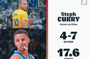 據(jù)統(tǒng)計,庫里生涯至今共出戰(zhàn)11次圣誕大戰(zhàn),戰(zhàn)績?yōu)?勝7負(fù),期間場均可以得到17.6分6.4助攻,三分命中率僅28%。