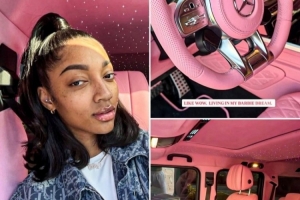 從照片可以看到,車內(nèi)裝飾全是芭比粉配色,還帶有豪華星空頂。