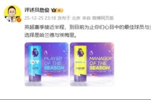 體育資訊12月25日訊 評述員詹俊社媒發(fā)文,談到了英超賽季半程的最佳球員與教練。