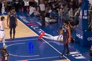 GIF-唐斯突破上籃被犯規(guī),重重摔倒在地上