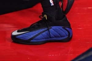 這雙球鞋采用外側(cè)藍(lán)色、內(nèi)側(cè)紅色的陰陽配色,鞋后跟處則有堪薩斯大學(xué)的吉祥物。