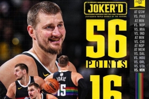 本場,約基奇出戰(zhàn)43分鐘,投籃21中15,三分6中4,罰球23中22,砍下56分16籃板15助攻2蓋帽,正負值+15!