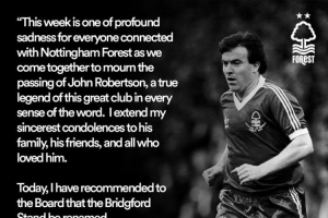 體育資訊12月27日訊 諾丁漢森林傳奇球星約翰·羅伯遜去世,他曾幫助球隊兩次奪得冠軍杯(歐冠前身)。對于這樣一名在俱樂部歷史上舉足輕重的人物,諾丁漢森林老板馬里納基斯提出了一個緬懷約翰·羅伯遜的方案。