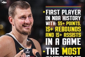 本場比賽,約基奇通過自己得分和助攻,合計為掘金貢獻(xiàn)了96分,歷史第三高,第一高是張伯倫的104分,第二為多諾萬·米切爾的100分。