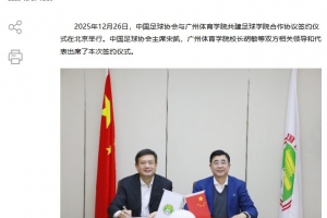 2025年12月26日,中國足球協(xié)會與廣州體育學(xué)院共建足球?qū)W院合作協(xié)議簽約儀式在北京舉行。中國足球協(xié)會主席宋凱,廣州體育學(xué)院校長胡敏等雙方相關(guān)領(lǐng)導(dǎo)和代表出席了本次簽約儀式。