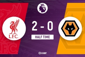 上半場(chǎng)補(bǔ)時(shí)3分鐘,利物浦2-0狼隊(duì)。
