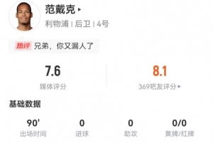 體育資訊12月28日訊 利物浦在本輪英超對陣?yán)顷?duì),范戴克本場數(shù)據(jù)如下: