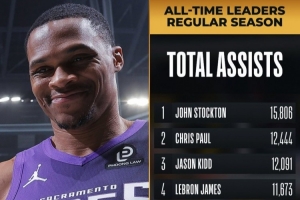 比賽開(kāi)局3分鐘,威少送出2次助攻,職業(yè)生涯助攻次數(shù)達(dá)到10142次,超越魔術(shù)師約翰遜獨(dú)占?xì)v史第七!