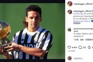 體育資訊12月28日訊 意大利足壇名宿巴喬更新社媒動態(tài),回顧32年前的今天贏得金球獎。
