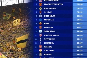 體育資訊12月29日訊 德轉(zhuǎn)發(fā)布2025年歐洲俱樂部場均上座率排行,多特第一、拜仁第二、曼聯(lián)第三。