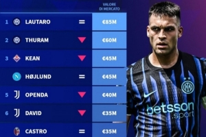 1、勞塔羅(國(guó)際米蘭),8500萬(wàn)歐元