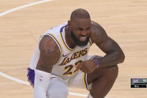 GIF-德羅贊擠掩護(hù)時這下肘到了詹姆斯的腰 有些不舒服 隨后被換下了