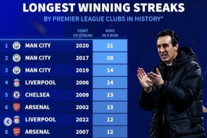 英超球隊歷史各項賽事最長連勝榜: