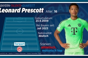 16歲門將萊昂納德·普雷斯科特身高已達1.96米,比諾伊爾還高兩厘米。他出生于紐約,但在柏林長大。2023年7月,他從柏林聯(lián)合轉會至拜仁,并憑借出色表現(xiàn)迅速接近一線隊。這位年輕的門將已經(jīng)開始與一線隊的門將教練邁克爾·雷納(45歲)和安德烈亞斯·羅塞爾(37歲)一起訓練。