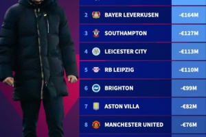 3、南安普頓:-1.27億歐