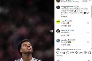 羅德里戈賽后社媒寫道:“‘風(fēng)雨過后,陽光總會重現(xiàn),保持信念????’感謝伯納烏,2026年再見。”