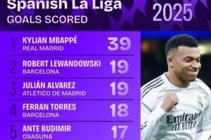 體育資訊12月30日訊 2025年接近尾聲,squawka也統(tǒng)計(jì)了本年度西甲進(jìn)球情況,姆巴佩獨(dú)自斷崖領(lǐng)跑。