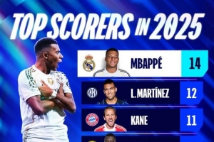 體育資訊12月31日訊 皇馬前鋒姆巴佩在2025年打進(jìn)59球,追平C羅記錄,創(chuàng)個(gè)人年度新高。歐冠官方社媒曬出2025年歐冠射手榜,其中姆巴佩以14球排名榜首。