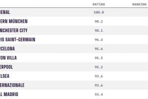 Opta俱樂部競技實力年終排名: