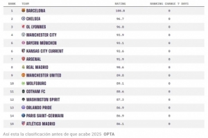 相比之下,男足的排名則有所不同。阿森納以滿分100分位居榜首,拜仁慕尼黑(98.2分)和曼徹斯特城(98.1分)分列第二和第三位。巴黎圣日耳曼(96.5分)和巴塞羅那(95.6分)也名列前茅。皇家馬德里男足目前排名第10,評分為93.4分,在最近一次更新中下降了兩個(gè)位置。切爾西(第8位,93.7分)和國際米蘭(第9位,93.6分)都超過了他們。